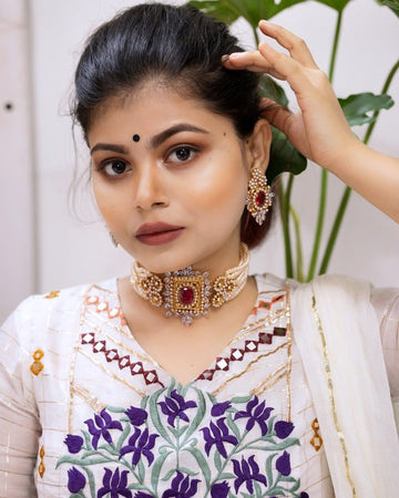 Handcrafted by skilled local artisans, this gold-plated brass necklace features elegant white pearls and a traditional floral pendant. A perfect fusion of heritage and modern style, it adds timeless charm to any look.